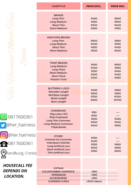 I am a Hair Braider based in Randburg, Cresta and I do housecalls in near surrounding areas from R50 (depending on location). Some services and prices include hairpiece. I also wash and treat wigs. Your support will be greatly appreciated.